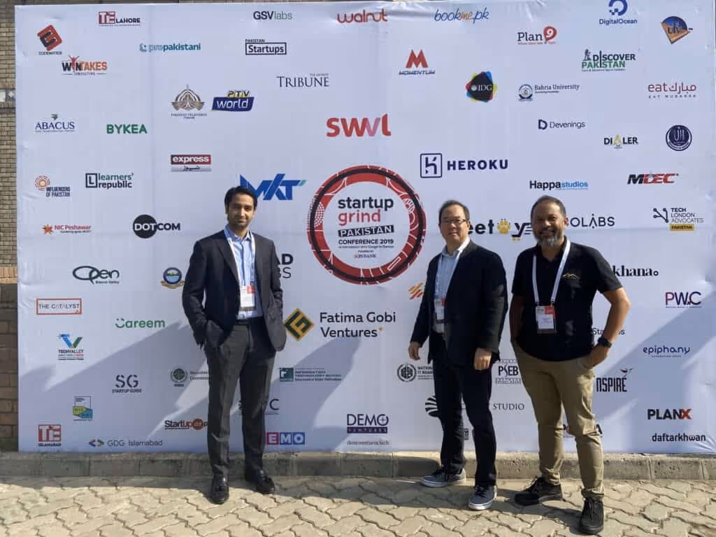 From left: Ali, Gobi founding partner Tom Tsao, and JB at the startup grind Pakistan conference in November 2019. Within two years, Covid-accelerateed digitisation would lead to record fundraising into Pakistani startups, with Fatima Gobi Ventures positioned in the right place, at the right time.