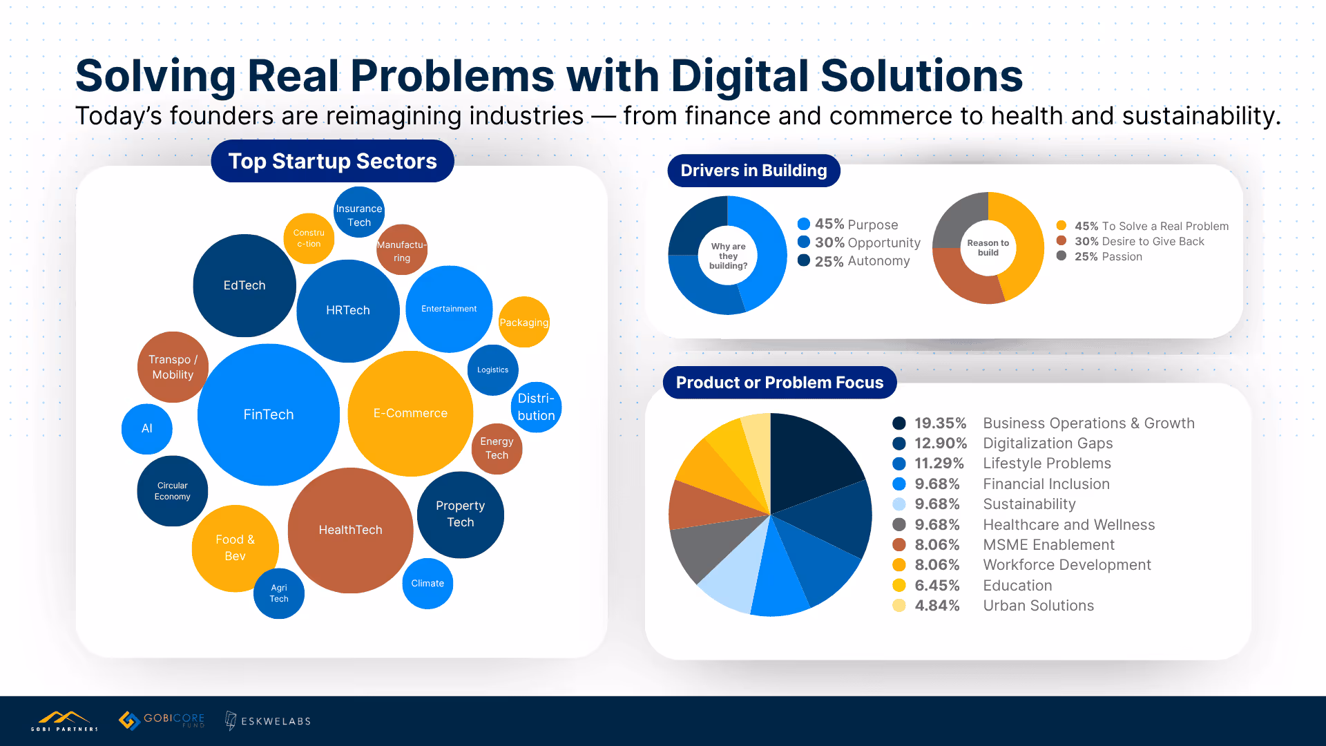 Around 70% also have prior corporate experience, which shapes how they approach problem-solving — balancing purpose, opportunity, and autonomy as their key drivers. This generation of founders is focused on addressing real and structural challenges such as digitalisation gaps, business growth barriers, and financial inclusion — signalling a shift toward building startups that tackle systemic issues with sustainable, technology-driven solutions.
