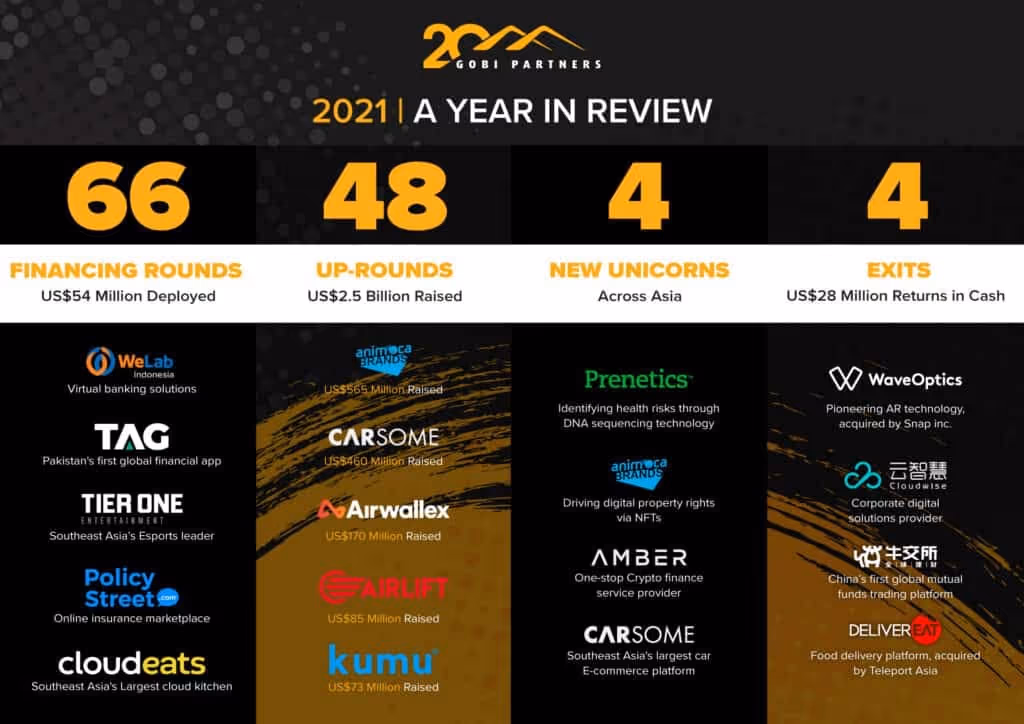 2021 marked the awakening of exciting new markets in Asia like the Philippines, Pakistan and Malaysia, with Gobi portfolio companies reaping the benefits of accelerated digitization. Gobi startups raised US$2.5 billion in 2021, 10x more than 2020, and 46x the US$54 million we deployed across our markets. Our stable of unicorns almost doubled to 9 (2021: 4 new unicorns).