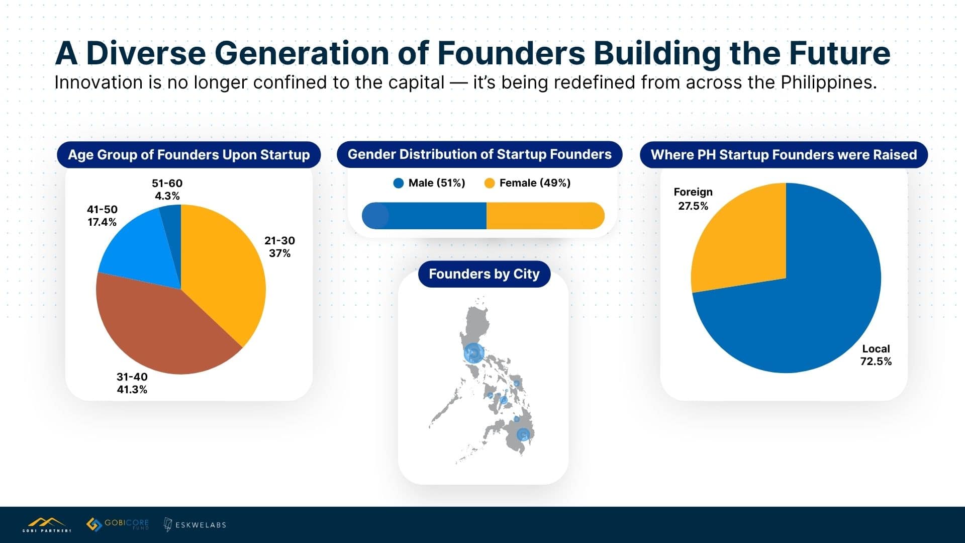 The Founder Survey offers a closer look at the people behind the ecosystem’s progress. Nearly 80% of founders are between 21 and 40 years old, underscoring a generation of early- to mid-career professionals driving the country’s innovation economy. Female representation has risen to 49%, signalling continued movement toward gender parity in leadership. Over 70% were born and raised in the Philippines, though a growing share of returnees and globally educated founders are bringing international experience to local ventures.